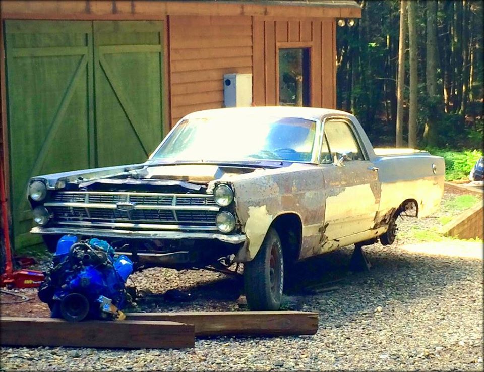 Whoever owns the remains of this ’67 Ford Galaxie 500 Ranchero is so proud of it that he’s left his engine on view for passersby to admire. What is it, gearheads? A 289? 390? 428?